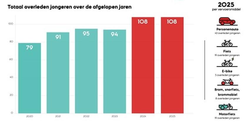 Het aantal jongeren dat omkomt in het verkeer blijft zorgwekkend hoog. In 2025 kwamen er opnieuw 108 jongeren tussen de 12 en 24 jaar om bij een verkeersongeval, blijkt uit cijfers van het Centraal Bureau voor de Statistiek (CBS). Daarmee blijft het aantal even hoog als in 2024 en wordt de eerder ingezette stijging niet gekeerd. Inmiddels werkt deze ontwikkeling ook door in het totaal aantal verkeersdoden, dat in 2025 opliep tot 759 slachtoffers: 84 meer dan een jaar eerder.