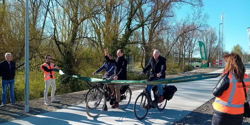 Met het gezamenlijk door een lint te fietsen opende de wethouder en de gedeputeerde van de provincie Groningen de lang verwachte fietsverbinding tussen Winsum
